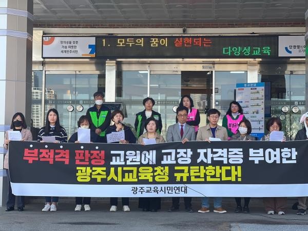 광주교육시민단체 연합인 광주교육시민연대(시민연대)는 20일 광주시교육청 앞에서 기자회견을 열고 “교원 4대 비위(성적조작, 성비위, 폭력, 금품수수)자를 교장으로 임용한 사실을 취소할 것”을 광주시교육청에 촉구했다.