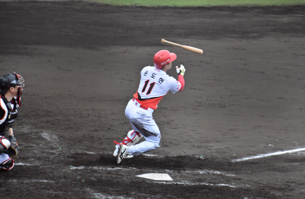 이날 경기에서 3번 타자 겸 2루수로 선발 출장한 윤도현은 첫 타석에서 KT 외국인 투수 쿠에바스의 초구를 공략해 안타를 만들었습니다. 그리고 두 번째 타석에서는 원상현을 상대로 1볼 1스트라이크에서 방망이를 휘둘렀습니다. 가운데로 몰린 128㎞ 슬라이더를 공략한 윤도현.