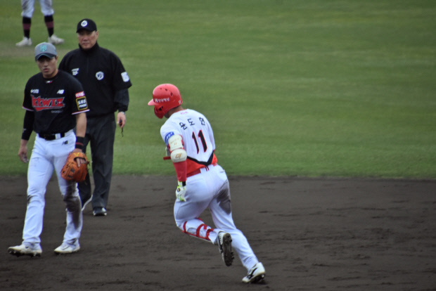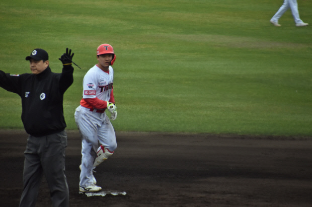 2-0으로 앞선 7회말 1사에서 김민을 상대로 이날 경기 4번째 안타를 2루타로 장식했습니다. 대타 고종욱의 좌전 적시타로 홈에 들어오면서 3-0을 만든 윤도현.