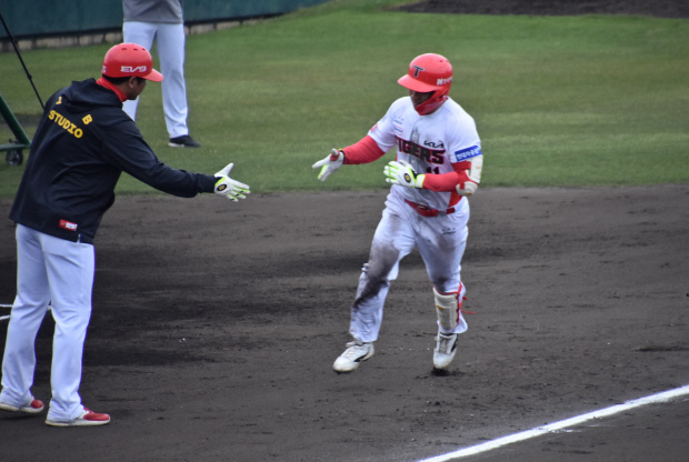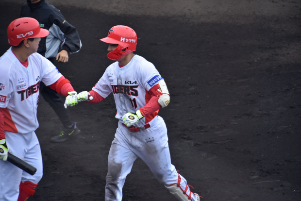 첫 연습경기 두 번째 타석에서 홈런으로 멀티안타를 기록하고 그라운드를 돈 윤도현.