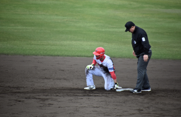 폭투로 2루까지 향했던 윤도현은 다시 한 번 폭투 때 진루를 시도하려다가 귀루에 실패하면서 아웃됐습니다. 하지만 4번째 타석에서 실수를 만회하는 안타를 기록합니다.