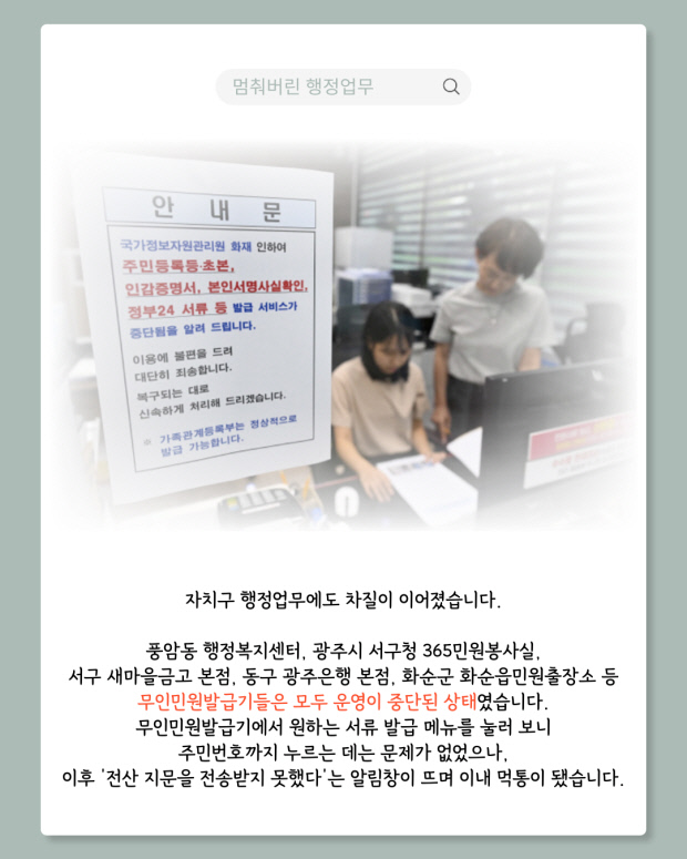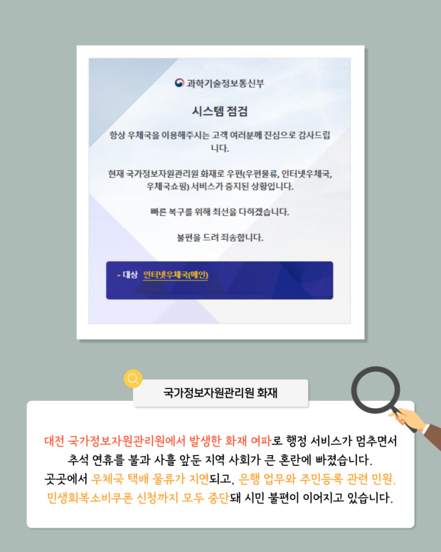 국가정보자원관리원에서 발생한 화재 여파로 우체국 입·출금, 행정 서비스 등이 멈추면서 추석 연휴를 불과 사흘 앞둔 지역 사회가 큰 혼란에 빠졌습니다.