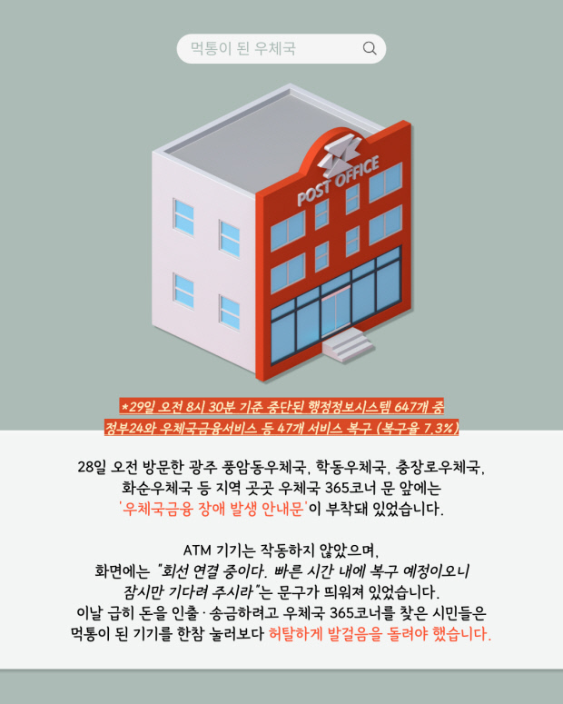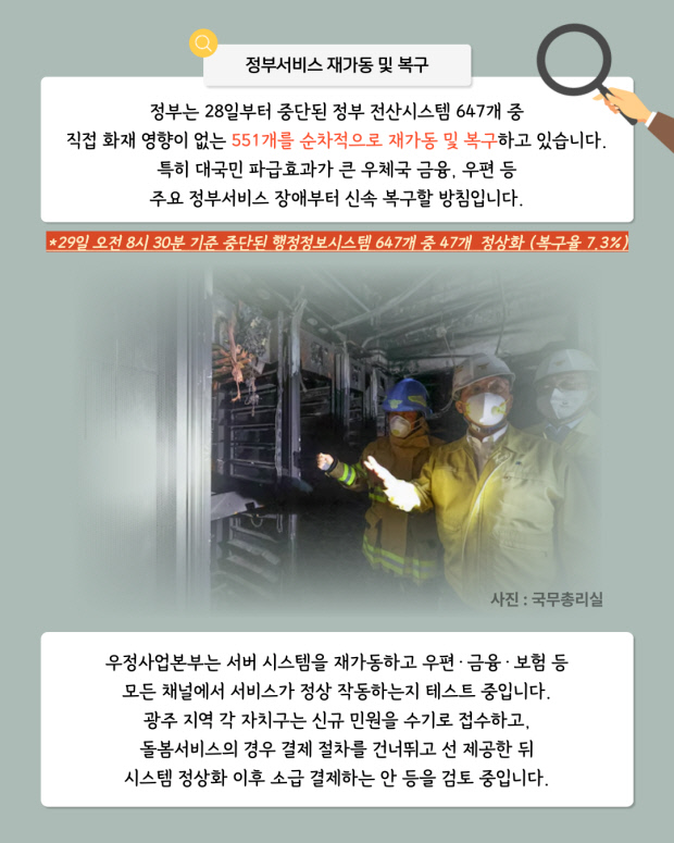 29일 오전 기준 중단된 정부 전산시스템 647개 중 정부24와 우체국금융서비스 등 47개 서비스가 복구됐습니다.