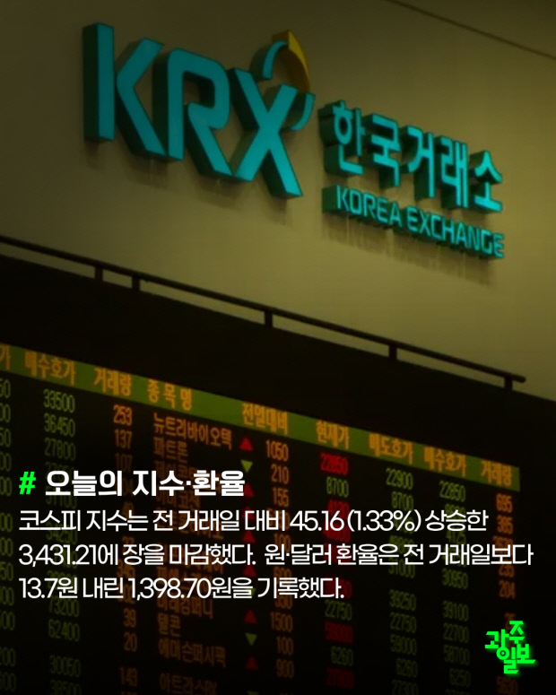 코스피 지수는 전 거래일 대비 45.16 (1.33%) 상승한 3,431.21에 장을 마감했다. 원·달러 환율은 전 거래일보다 13.7원 내린 1,398.70원을 기록했다.