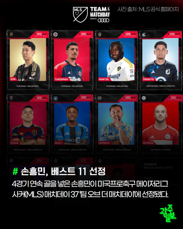 4경기 연속 골을 넣은 손흥민이 미국프로축구 메이저리그사커(MLS) 매치데이 37 ‘팀 오브 더 매치데이’에 선정됐다.