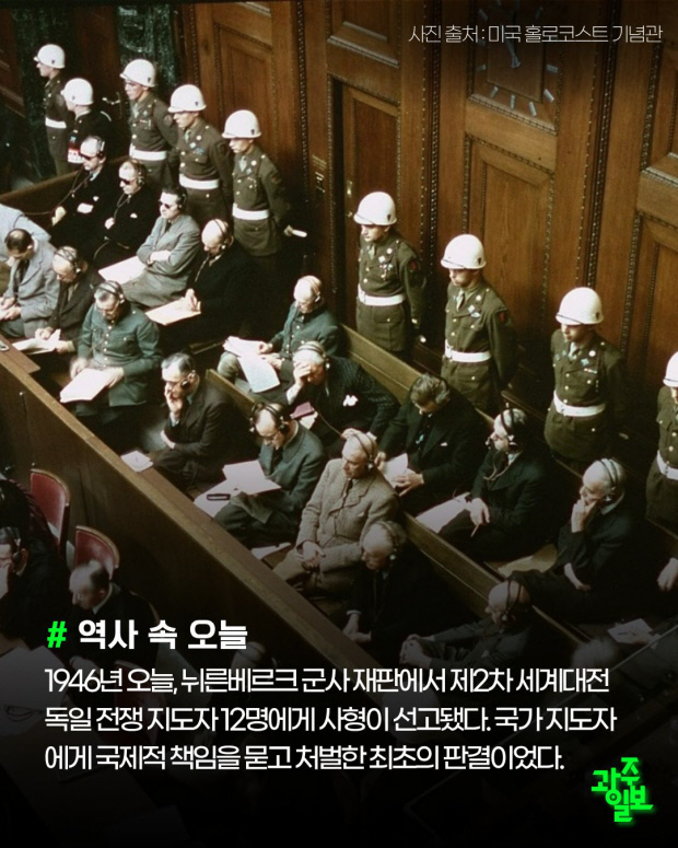 1946년 오늘, 뉘른베르크 군사 재판에서 제2차 세계대전 독일 전쟁 지도자 12명에게 사형이 선고됐다. 국가 지도자에게 국제적 책임을 묻고 처벌한 최초의 판결이었다.