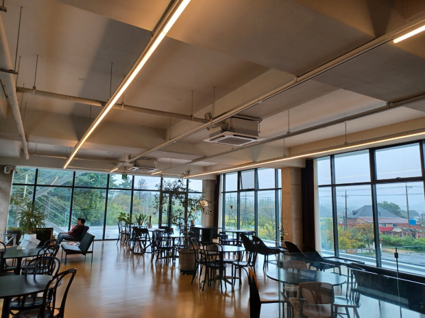탁 트인 통창으로 바깥을 감상할 수 있는 담양군 금성면 ‘생츄어리’ 카페.