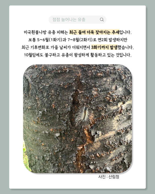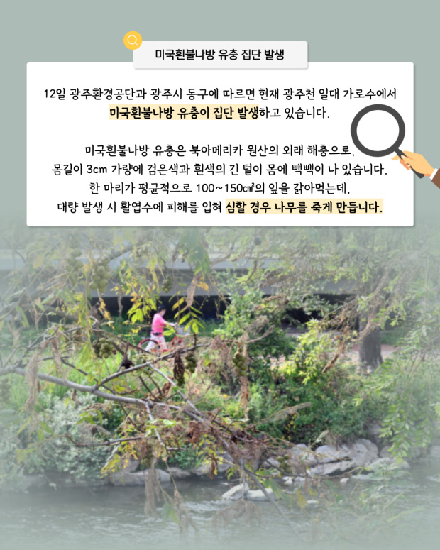 12일 광주환경공단과 광주시 동구에 따르면 현재 광주천 일대 가로수에서 미국흰불나방 유충이 집단 발생하고 있습니다.