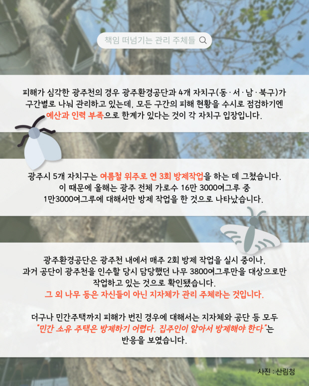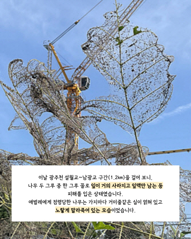 이날 광주천 설월교~남광교 구간(1.2㎞)을 걸어 보니, 나무 두 그루 중 한 그루 꼴로 잎이 거의 사라지고 잎맥만 남는 등 피해를 입은 상태였습니다. 애벌레에게 점령당한 나무는 가지마다 거미줄같은 실이 얽혀 있고 노랗게 말라죽어 있는 모습이었습니다.