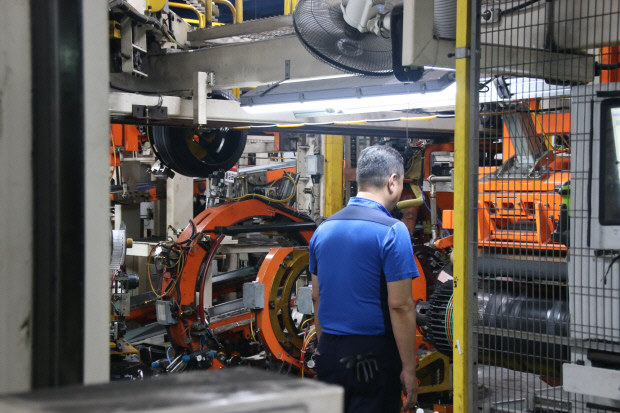 ![]() 금호타이어가 광주공장 관계자가 10월 재가동을 위해 성형기 시범 가동을 하고 있다. <금호타이어 제공> |