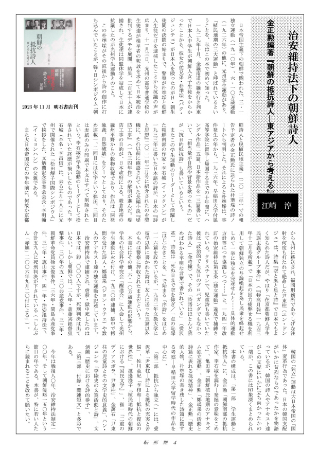 ‘치안유지법 아래의 조선 시인’이라는 제목으로 서평을 발표한 이는 지난 5월 광주시립미술관 주최 마쓰다 도키코 국제심포지엄(하정웅미술관)에 발제자로 참가한 ‘마쓰다 도키코 회’ 에자키 준 대표<광주일보’ 2025년 5월 20일 자 인터뷰>