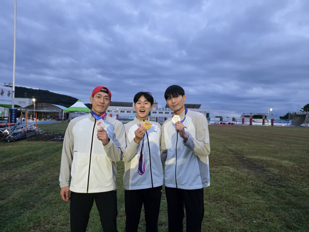 광주시청 근대4종에 출전한 성진수·전웅태·윤상민 선수가 메달을 들어보이며 기뻐하고 있다.
