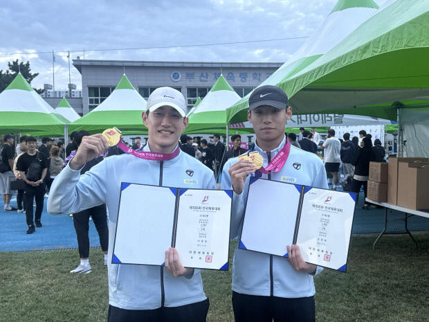 근대5종 단체전에서 금메달을 딴 전남도청의 서창완과 김영하 선수.