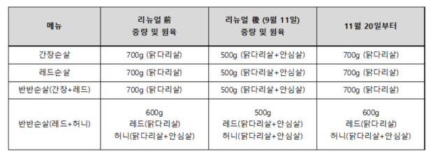 중량과 원육을 리뉴얼 전으로 환원하는 메뉴는 ‘간장순살’, ‘레드순살’, ‘반반순살(간장+레드)’, ‘반반순살(레드+허니)’다.