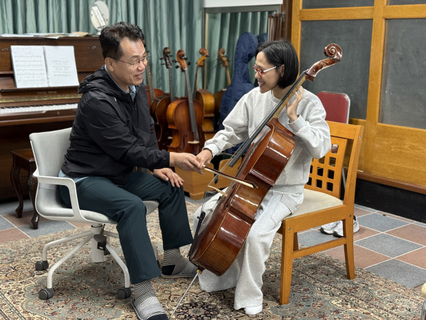 ![]() 공연을 앞두고 유니크앙상블 문맹권 대표(왼쪽)와 김가은 양이 첼로 레슨하는 모습. |