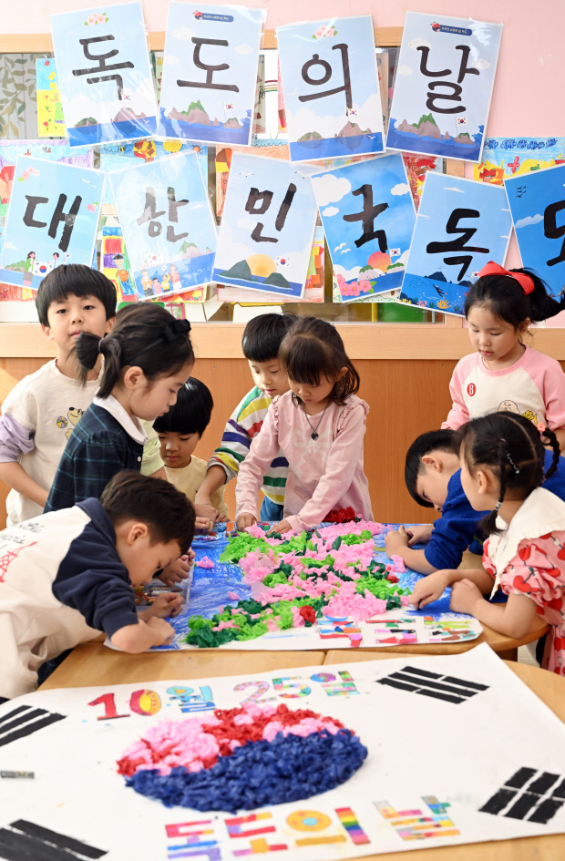 ![]() 독도의 날을 이틀 앞둔 23일 광주시 북구청어린이집에서 아이들이 색종이를 이용해 도화지에 모자이크로 태극기와 한반도 모양을 꾸미고 있다. 어린이집은 아이들에게 나라 사랑하는 마음을 심어주기 위해 이번 프로그램을 마련했다. /나명주 기자 mjna2kwangju.co.kr |