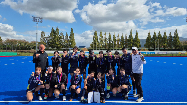 23일 부산 강서체육공원 하키경기장에서 열린 제106회 전국체육대회 여자일반부 하키 결승전에서 목포시청 하키팀이 은메달을 목에 걸고 포즈를 취하고 있다. <목포시청 하키팀 제공>