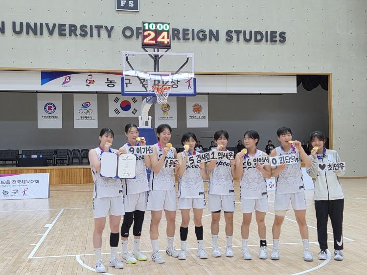 광주수피아여고 농구부가 23일 부산외국어대학교 체육관에서 열린 선일여고와의 전국체전 여고부 농구 결승전 후 시상식에서 금메달을 목에 걸고 포즈를 취하고 있다. <전남도체육회 제공>