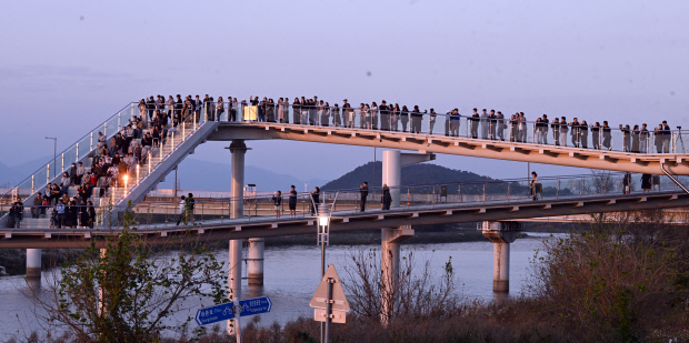 주말인 25일 광주시 서구 서창들녘 인근 영산강변 ‘감성조망대’에 많은 시민들이 노을을 보기 위해 기다리고 있다. /나명주 기자 mjna@kwangju.co.kr