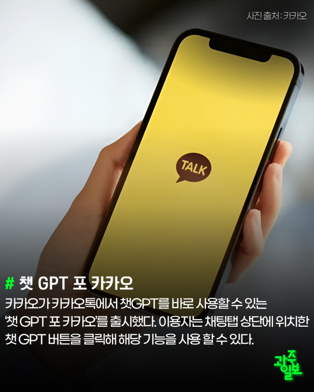 카카오가 카카오톡에서 챗GPT를 바로 사용할 수 있는 ‘챗 GPT 포 카카오’를 출시했다. 이용자는 채팅탭 상단에 위치한 챗 GPT 버튼을 클릭해 해당 기능을 사용 할 수 있다.