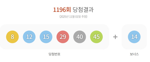 1일 진행된 제1196회 로또복권 추첨에서 ‘8, 12, 15, 29, 40, 45’가 1등 당첨번호가 됐다.