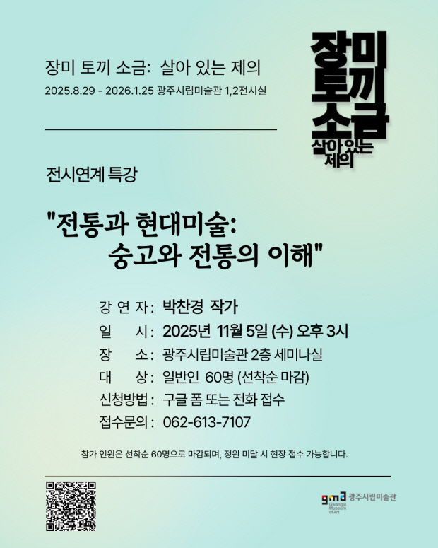 이번 강연에서 박 작가는 ‘전통과 현대미술: 숭고와 전통의 이해’를 주제로 전통에 내재된 단절, 상처, 기억을 모티브로 숭고의 미학을 견지할 수 있다는 메시지를 전달할 예정이다.