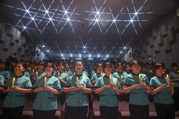 ![]() 광주대학교 간호학과의 제15회 나이팅게일 선서식이 5일 오후 남구 진월동 광주대학교 호심관 대강당에서 열렸다. 212명의 간호학과 학생들이 생명존중과 헌신을 다짐하는 선서를 하고 있다. /김진수 기자 jeans@kwangju.co.kr |