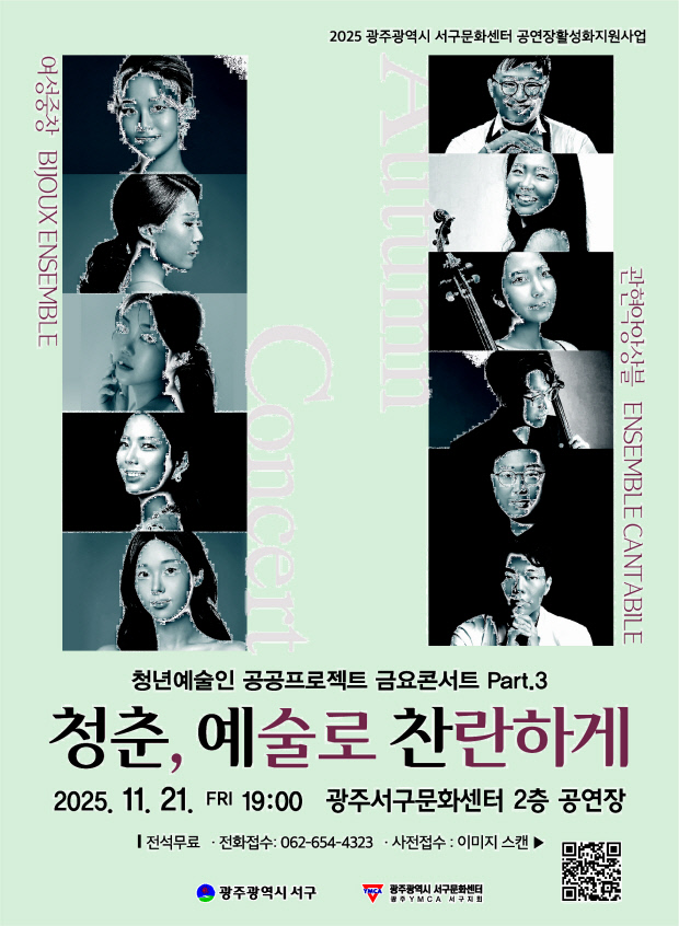 광주 서구문화센터가 오는 21일 오후 7시 2층 공연장에서 ‘청춘, 예술로 찬란하게 part.3-가을 콘서트’를 연다. 이번 공연은 청년예술인 지원사업인 ‘청춘, 예술로 찬란하게’ 시리즈의 마지막 무대로 지역 청년 음악인들이 함께 꾸미는 클래식 콜라보 무대다.