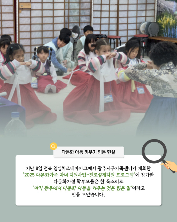 지난 8일 전북 임실치즈테마파크에서 광주서구가족센터가 개최한 ‘2025 다문화가족 자녀 지원사업-진로설계지원 프로그램’에 참가한 다문화가정 학부모들은 한 목소리로 “아직 광주에서 다문화 아동을 키우는 것은 힘든 일”이라고 입을 모았습니다.