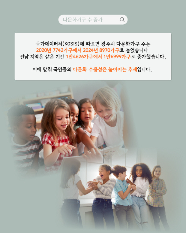 국가데이터처(KOSIS)에 따르면 광주시 다문화가구 수는 2020년 7742가구에서 2024년 8970가구로 늘었습니다. 전남 지역은 같은 기간 1만4626가구에서 1만6999가구로 증가했습니다. 이에 맞춰 국민들의 다문화 수용성은 높아지는 추세입니다.