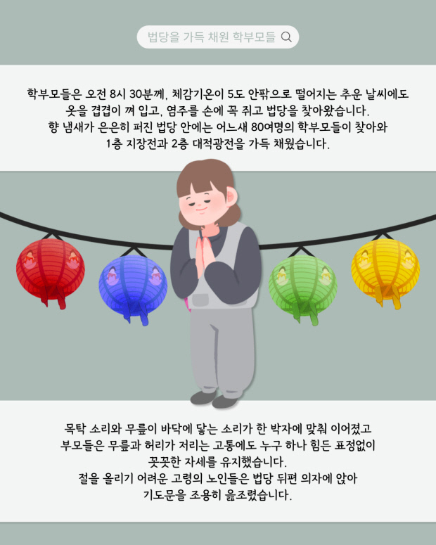 학부모들은 오전 8시 30분께, 체감기온이 5도 안팎으로 떨어지는 추운 날씨에도 옷을 겹겹이 껴 입고, 염주를 손에 꼭 쥐고 법당을 찾아왔습니다. 향 냄새가 은은히 퍼진 법당 안에는 어느새 80여명의 학부모들이 찾아와 1층 지장전과 2층 대적광전을 가득 채웠습니다.