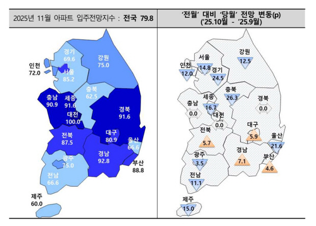 수도권의 경우 서울(100.0→85.2, 14.8p↓), 인천(84.0→72.0 12.0p↓), 경기(94.1→69.6, 24.5p↓) 모두 대폭 하락했다.