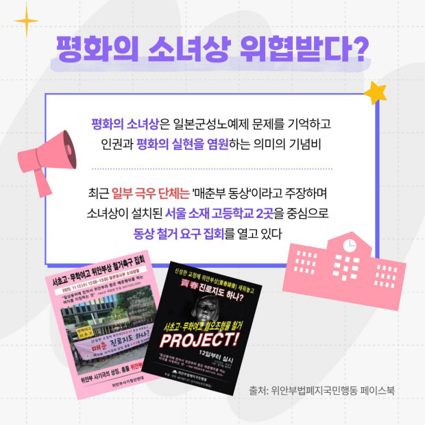 최근 일부 극우 단체가 ‘평화의 소녀상’을 ‘매춘부 동상’이라고 주장하며 소녀상이 설치된 서울 소재 고등학교 2곳을 중심으로 철거 요구 집회를 열고 있다.