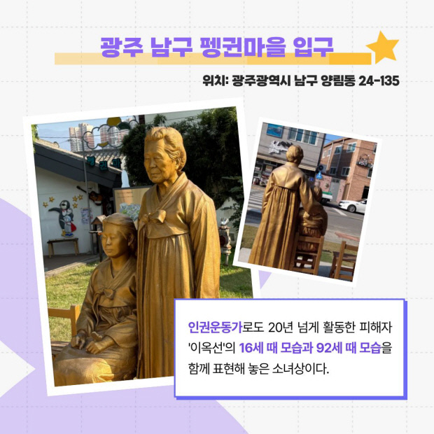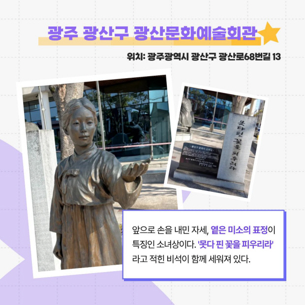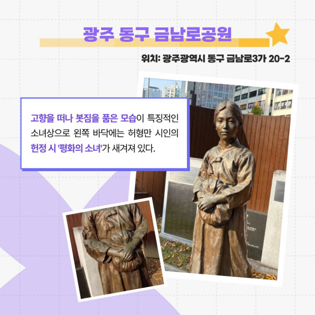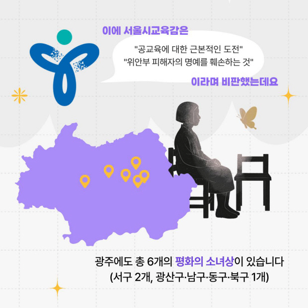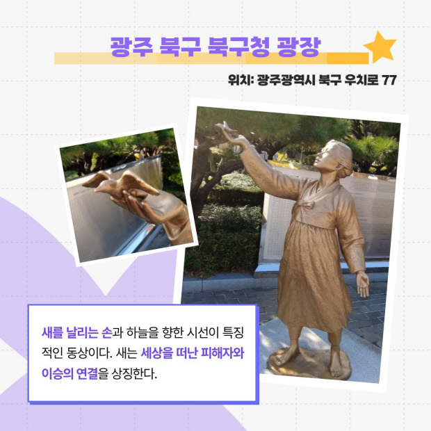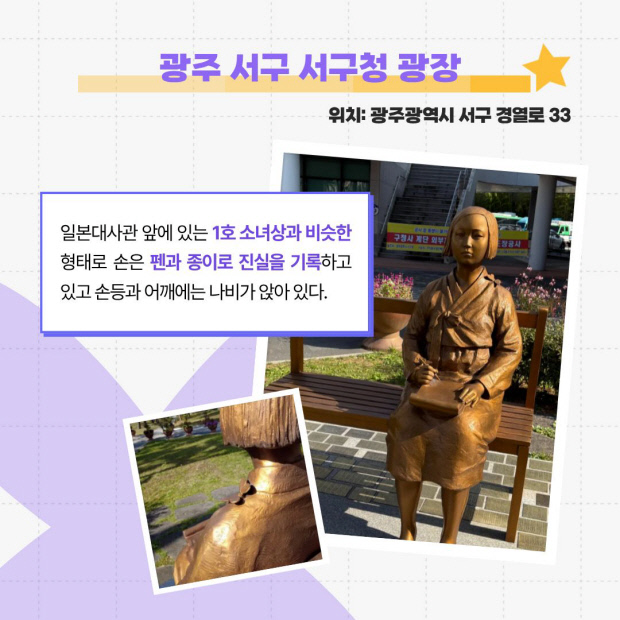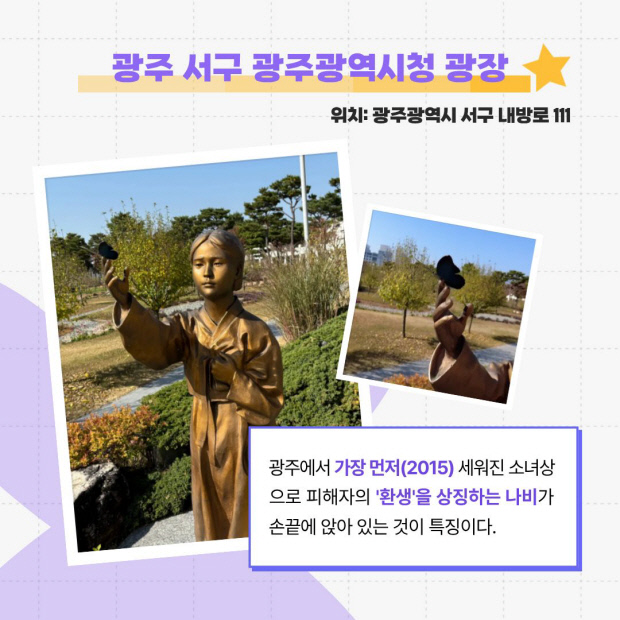 광주시에도 광주시청 광장을 비롯해 다양한 모양과 의미를 지닌 6개(서구 2개, 광산구·남구·동구·북구 1개)의 평화의 소녀상이 있다.