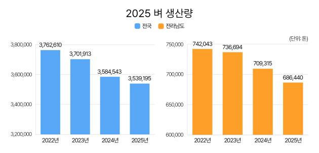 ![]() 2025년 전국 및 전남 벼 생산량/그래픽=안재현 인턴 기자 screamsoloo@gmail.com |