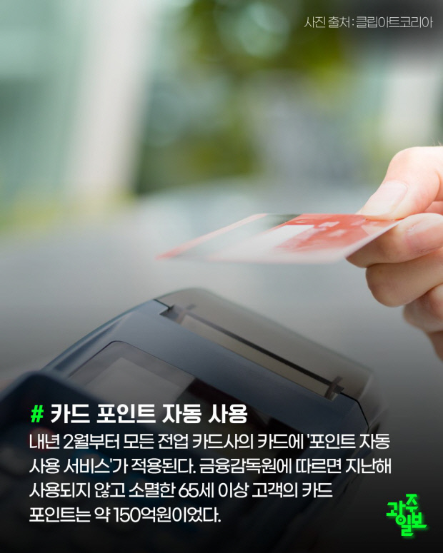 내년 2월부터 모든 전업 카드사의 카드에 ‘포인트 자동 사용 서비스’가 적용된다. 금융감독원에 따르면 지난해 사용되지 않고 소멸한 65세 이상 고객의 카드 포인트는 약 150억원이었다.