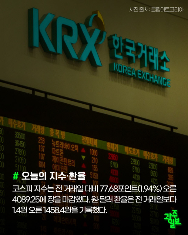 코스피 지수는 전 거래일 대비 77.68포인트(1.94%) 오른 4089.25에 장을 마감했다. 원·달러 환율은 전 거래일보다 1.4원 오른 1458.4원을 기록했다.