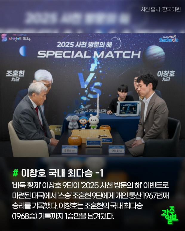 ‘바둑 황제’ 이창호 9단이 ‘2025 사천 방문의 해’ 이벤트로 마련된 대국에서 ‘스승’ 조훈현 9단에게 개인 통산 1967번째 승리를 기록했다. 이창호는 조훈현의 국내 최다승(1968승) 기록까지 1승만을 남겨뒀다.