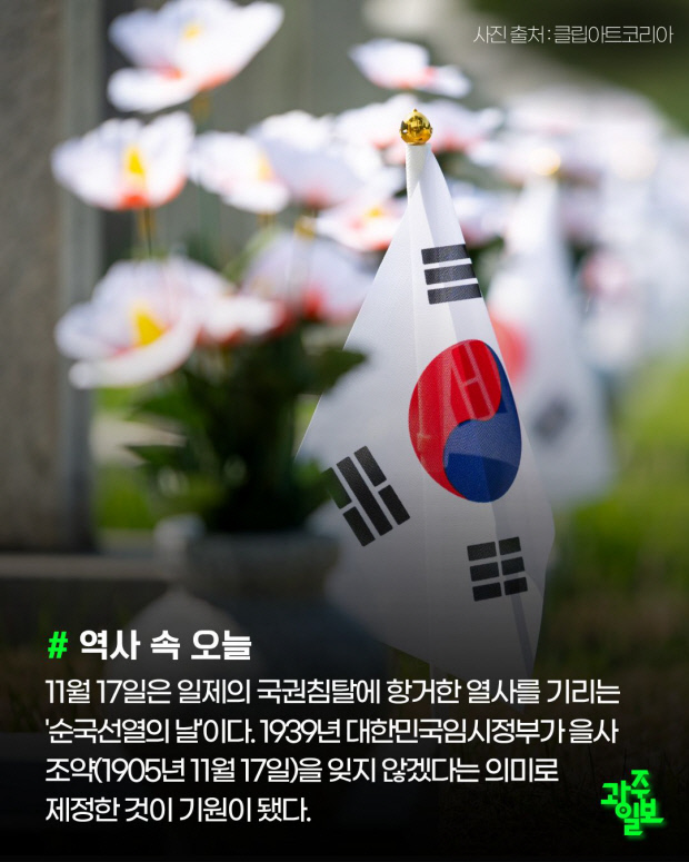 11월 17일은 일제의 국권침탈에 항거한 열사를 기리는 ‘순국선열의 날’이다. 1939년 대한민국임시정부가 을사조약(1905년 11월 17일)을 잊지 않겠다는 의미로 제정한 것이 기원이 됐다.