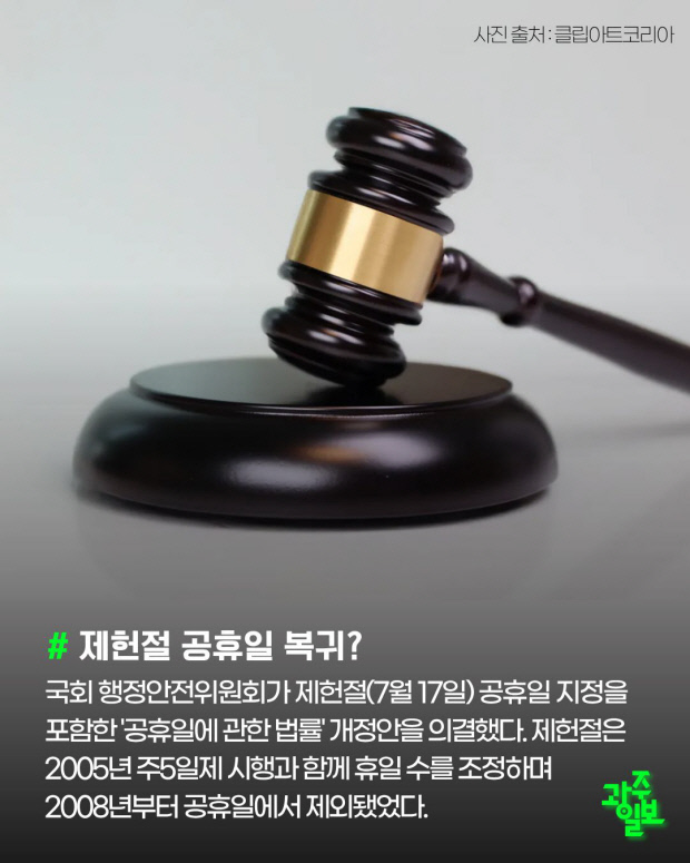 국회 행정안전위원회가 제헌절(7월 17일) 공휴일 지정을 포함한 ‘공휴일에 관한 법률’ 개정안을 의결했다. 제헌절은 2005년 주5일제 시행과 함께 휴일 수를 조정하며 2008년부터 공휴일에서 제외됐었다.