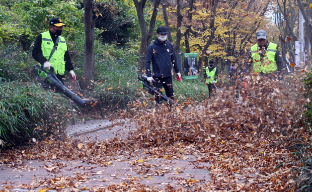 17일 광주 북구 운암동 예술의전당 후문 가로수길에서 북구청 청소행정과 기동반 직원들이 낙엽으로 인한 배수로 막힘 현상 방지를 위해 전동송풍기를 이용해 인도에 수북이 쌓인 낙엽을 치우고 있다.