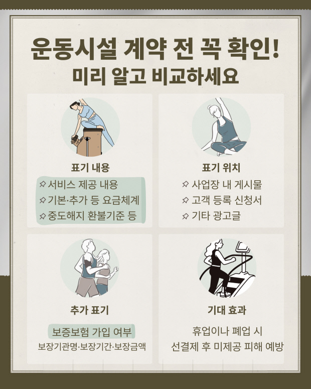 결혼서비스업자는 서비스 구성, 옵션별 요금, 계약 해지 시 위약금·환급기준 등을 표시해야 하며, 피트니스 사업장은 서비스 내용·요금체계·중도해지 환불기준은 물론 보증보험 등의 가입 여부 및 보장내용을 추가로 표시해야 한다.
