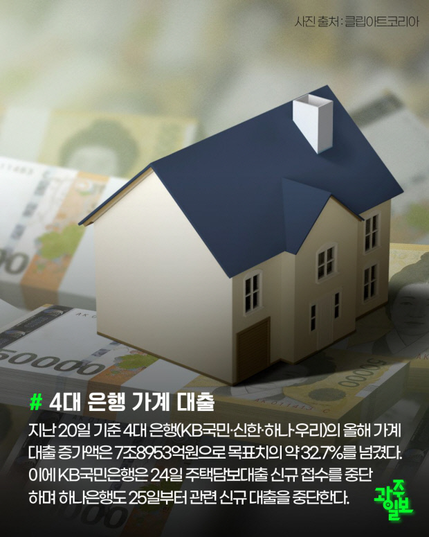 지난 20일 기준 4대 은행(KB국민·신한·하나·우리)의 올해 가계 대출 증가액은 7조8953억원으로 목표치의 약 32.7%를 넘겼다. 이에 KB국민은행은 24일 주택담보대출 신규 접수를 중단하며 하나은행도 25일부터 관련 신규 대출을 중단한다.