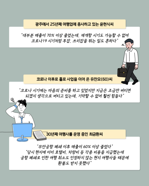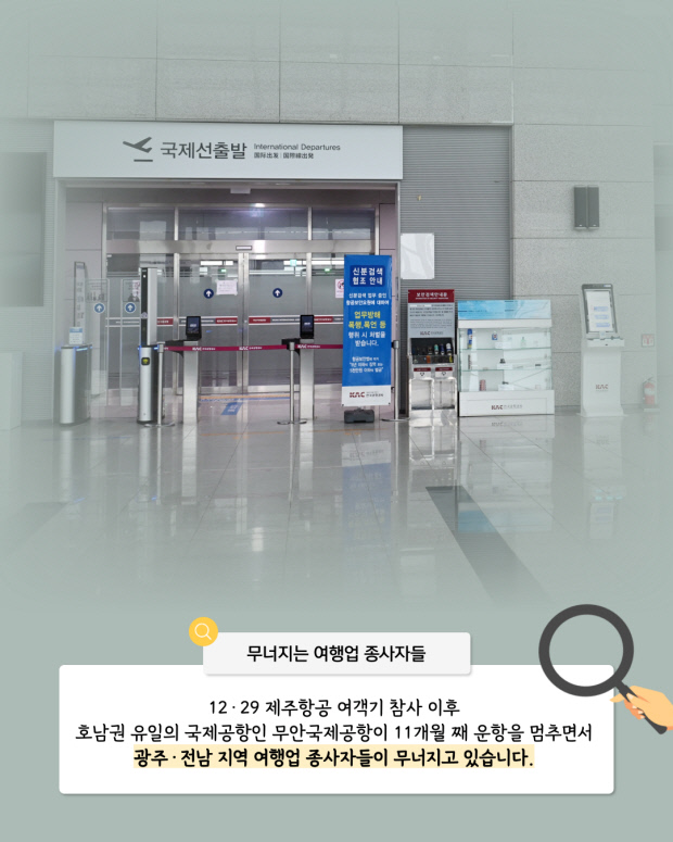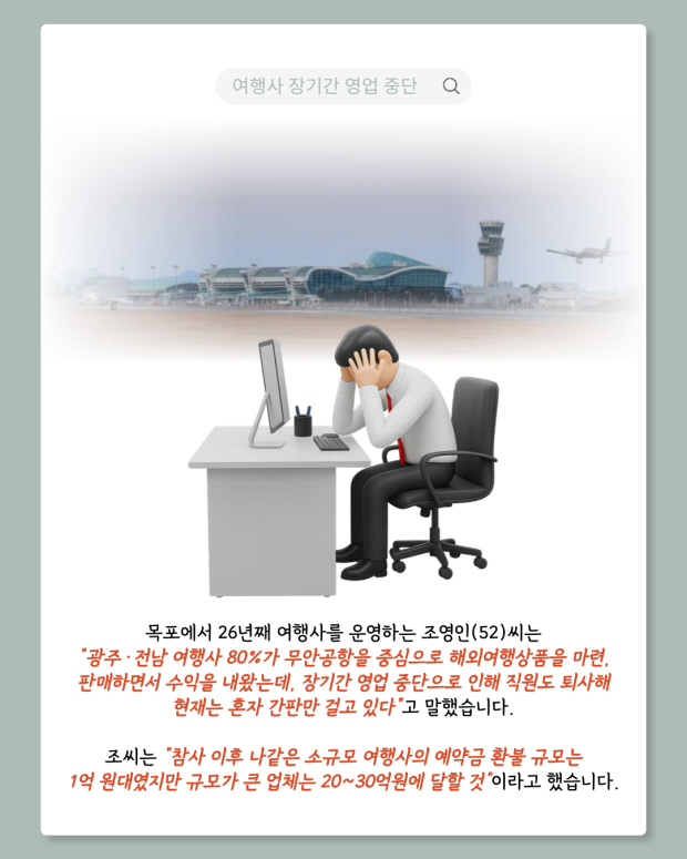 A씨 뿐 아니라 광주·전남 여행업계는 무안공항 폐쇄로 여행객 모집이 불가능해지면서 문을 닫거나 다른 일자리를 알아보면서 버티고 있는 실정입니다.