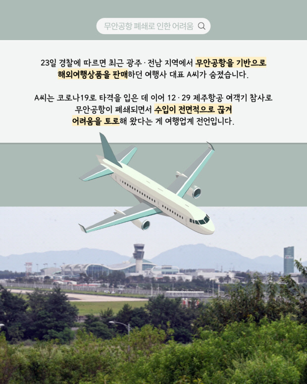 A씨는 코로나19로 타격을 입은 데 이어 12·29 제주항공 여객기 참사로 무안공항이 폐쇄되면서 수입이 전면적으로 끊기면서 어려움을 토로해 왔다는 게 여행업계 전언입니다.