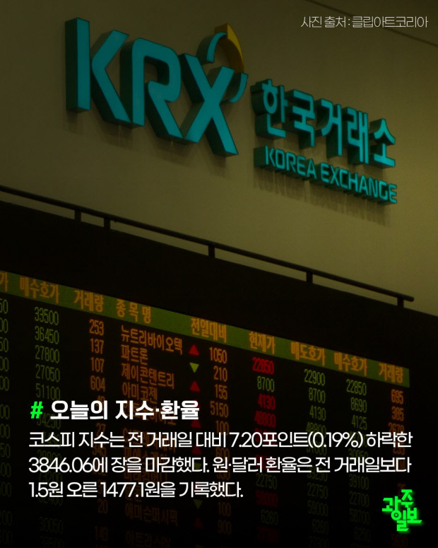 코스피 지수는 전 거래일 대비 7.20포인트(0.19%) 하락한 3846.06에 장을 마감했다. 원·달러 환율은 전 거래일보다 1.5원 오른 1477.1원을 기록했다.
