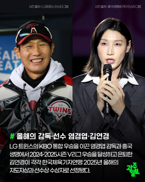 LG 트윈스의 KBO 통합 우승을 이끈 염경엽 감독과 흥국생명에서 2024-2025시즌 V리그 우승을 달성하고 은퇴한 김연경이 각각 한국체육기자연맹 2025년 올해의 지도자상과 선수상 수상자로 선정됐다.