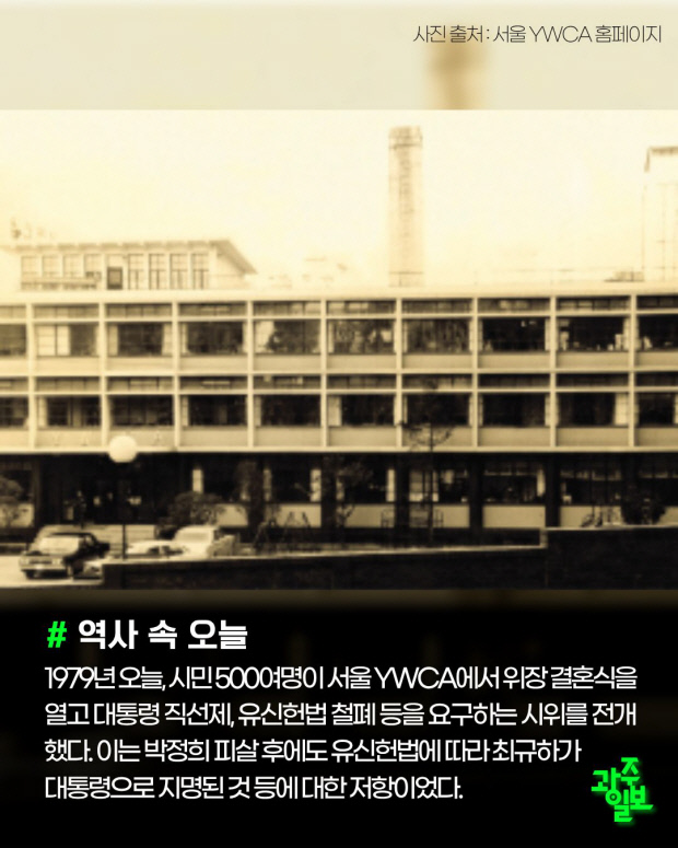 1979년 오늘, 시민 500여명이 서울 YWCA에서 위장 결혼식을 열고 대통령 직선제, 유신헌법 철폐 등을 요구하는 시위를 전개했다. 이는 박정희 피살 후에도 유신헌법에 따라 최규하가 대통령으로 지명된 것 등에 대한 저항이었다.