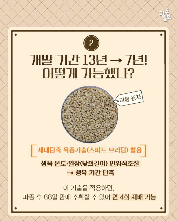 ‘세대단축 육종 기술’은 작물의 생육 온도와 일장(낮의 길이) 등을 인위적으로 조절해 생육기간을 단축함으로써 품종 개발 기간을 크게 줄이는 기술이다.