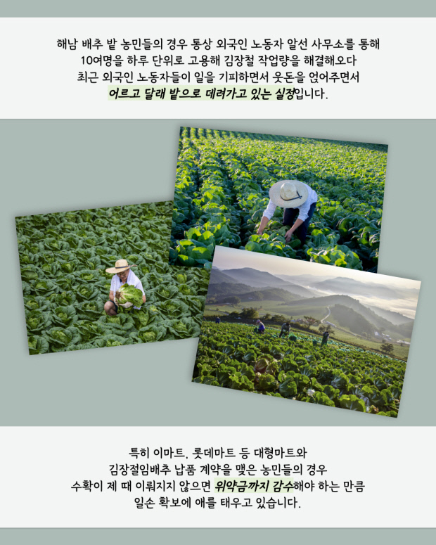 해남 배추 밭 농민들의 경우 통상 외국인 노동자 알선 사무소를 통해 10여명을 하루 단위로 고용해 김장철 작업량을 해결해오다 최근 외국인 노동자들이 일을 기피하면서 웃돈을 얹어주면서 어르고 달래 밭으로 데려가고 있는 실정입니다.